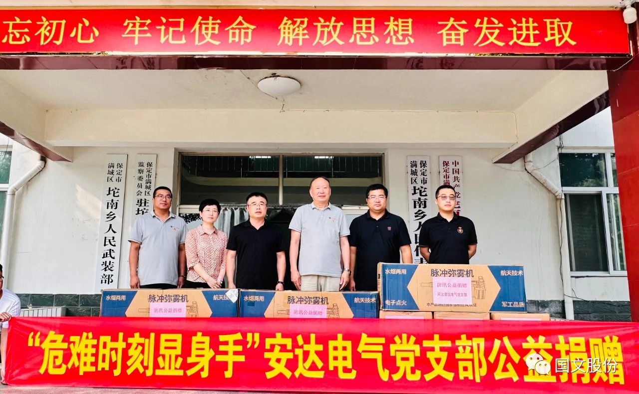 8月10日,安达电气党支部响应满城区组织部倡议,通过组织部了解灾区的实际需求,组织安达电气党支部的党员及积极分子为防汛爱心捐款,用该善款紧急采购了一批脉冲弥雾机及84消毒液等防护物资,运往满城区坨南乡政府,支援灾后区域的消杀工作。
